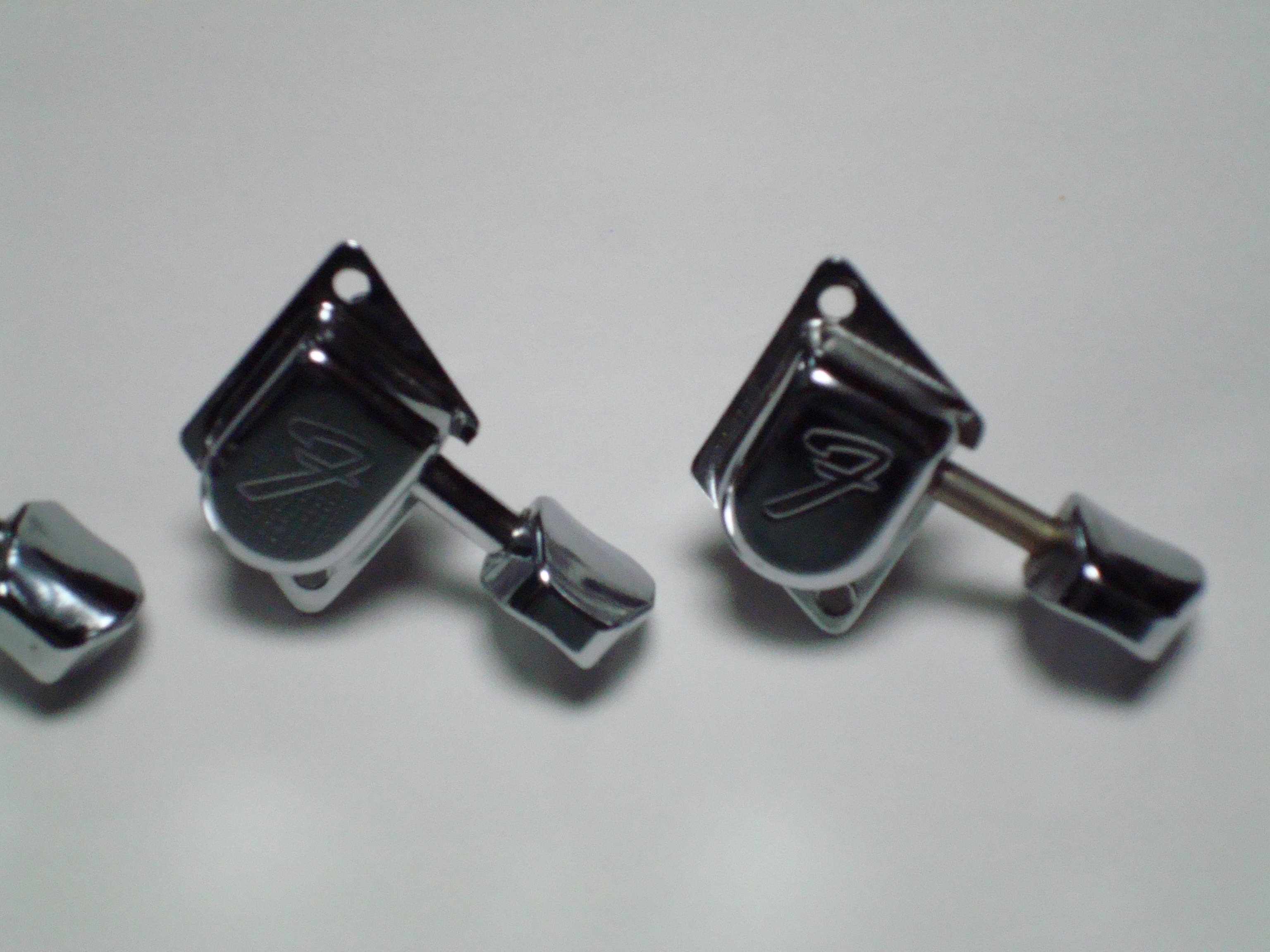 現行のFender USAFender Japanの双方がシャーラーF-Keyを使用し、またReplacement Partsとしてセット供給している。この現行シャーラーF-Keyにシャフト長が2種類存在する。上記の写真のようにMEX現行USA)が一番短いが、真ん中の1976年後期のものと同じ長さのシャフトのものも現行品で存在するのだ。実際に筆者は2006年にReplacement Partsとして購入したF-Keyのセットで、シャフト長の長いものを入手した。