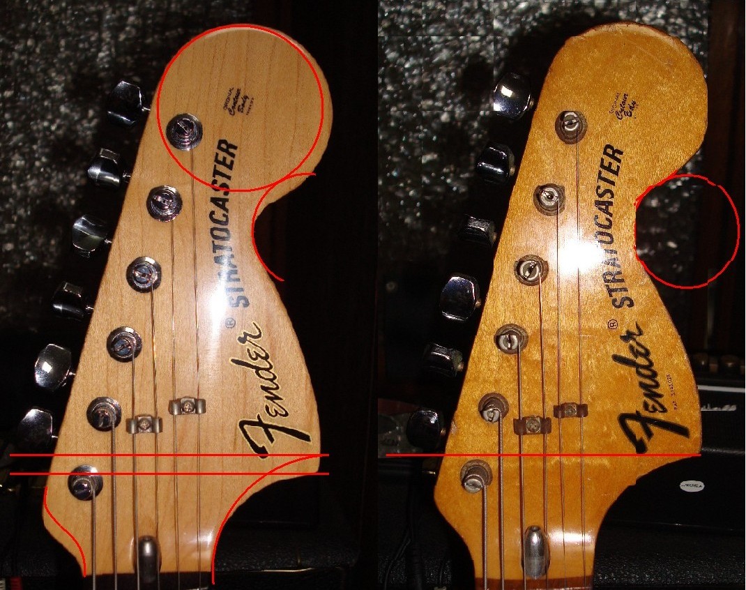 現行Fenderは、ナットからヘッド・トップまでの長さが短い上にトップの円の径が大きく、Stratocasterロゴマーク下のざぐりカーブのRは小さい。以前の物はRを大きくえぐっている。