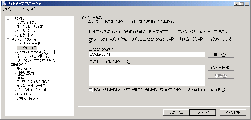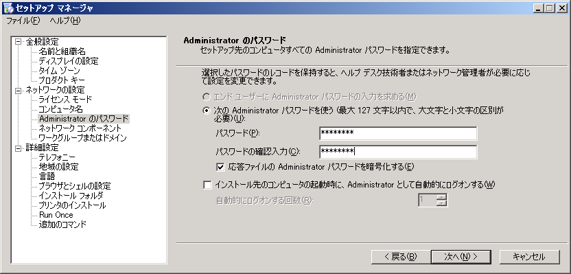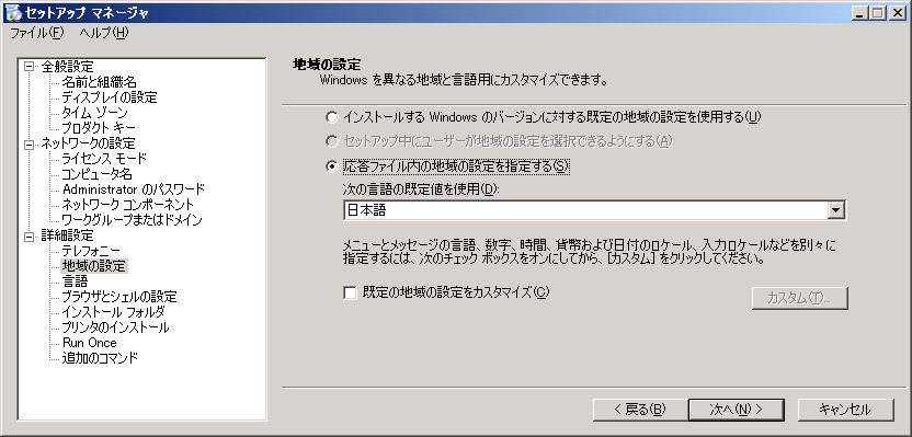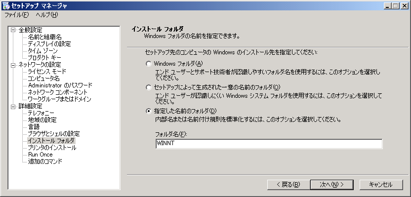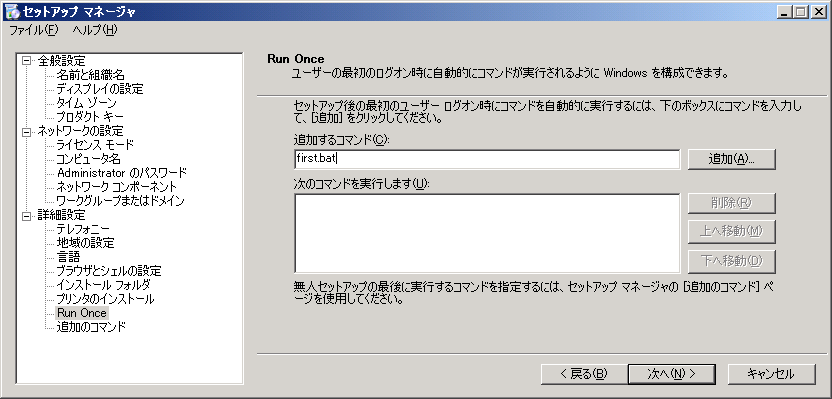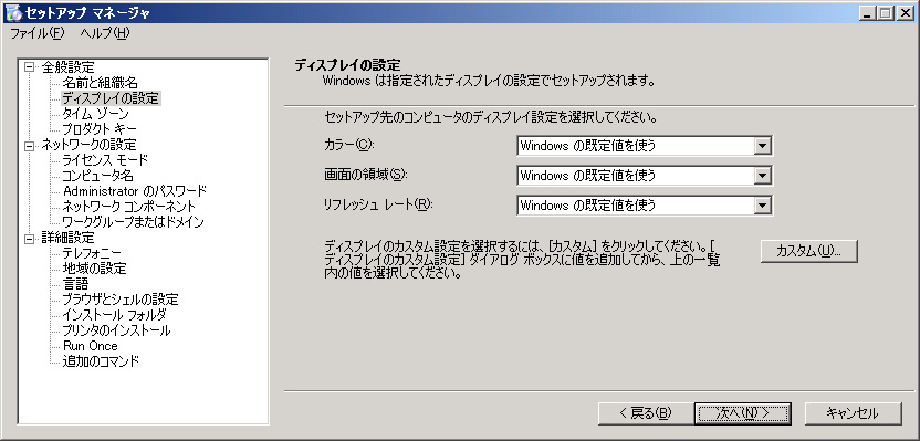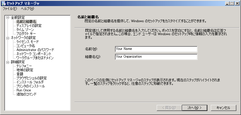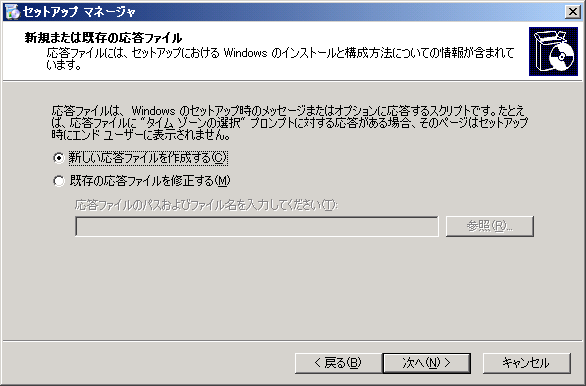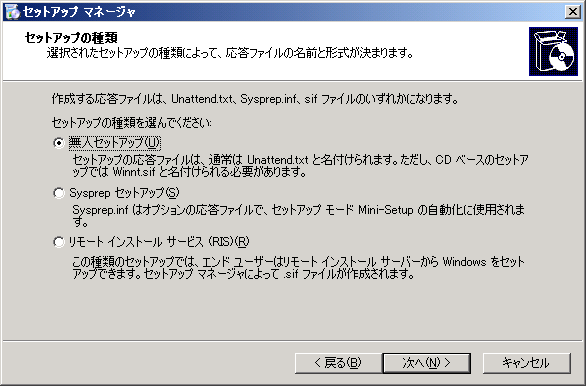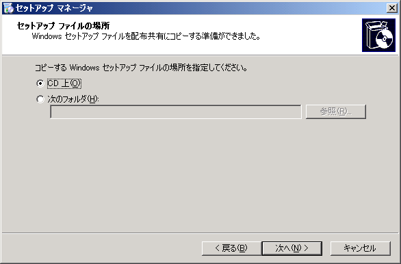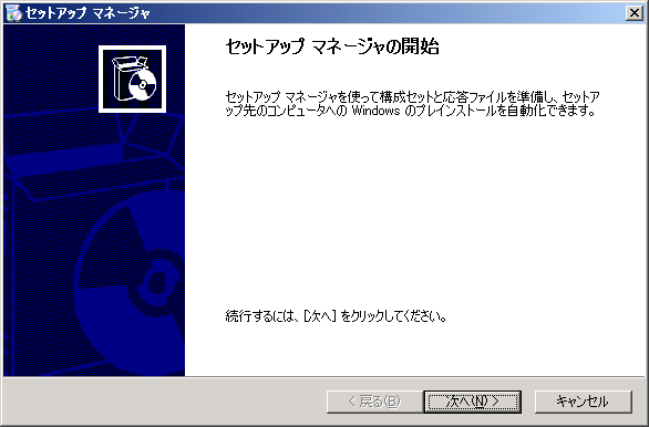セットアップマネージャーの起動配布共有を新規に作成する場合setupmgr.exeを起動するとウィザードが開始される。次へをクリック。