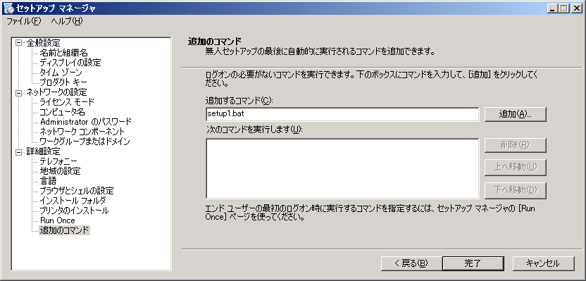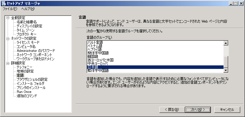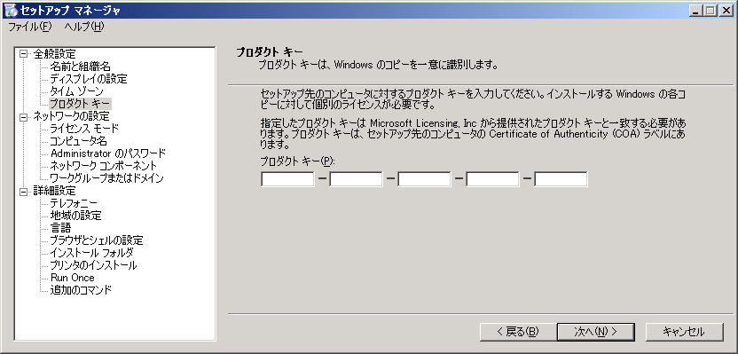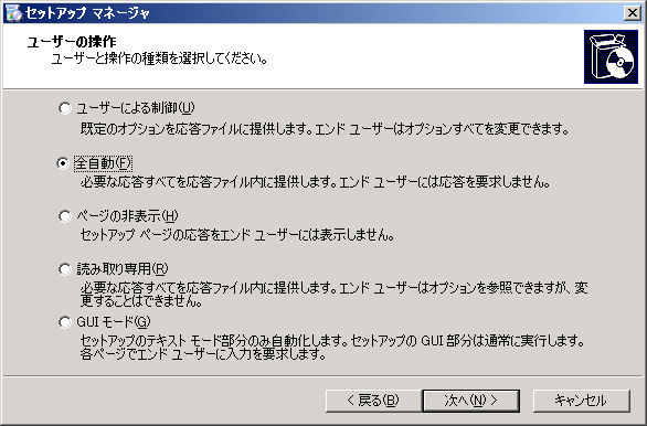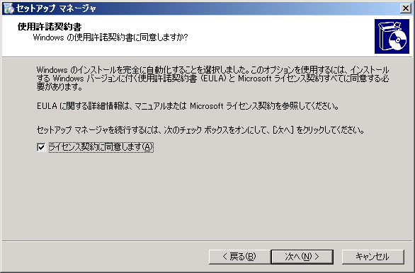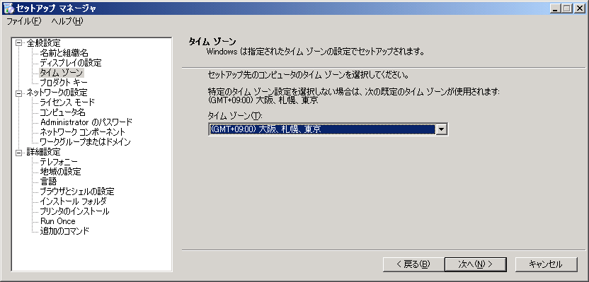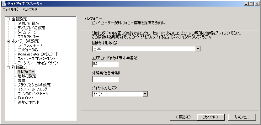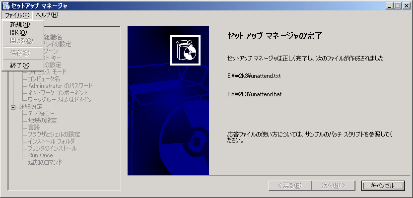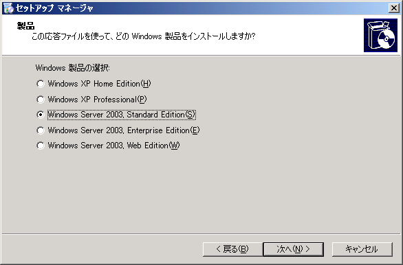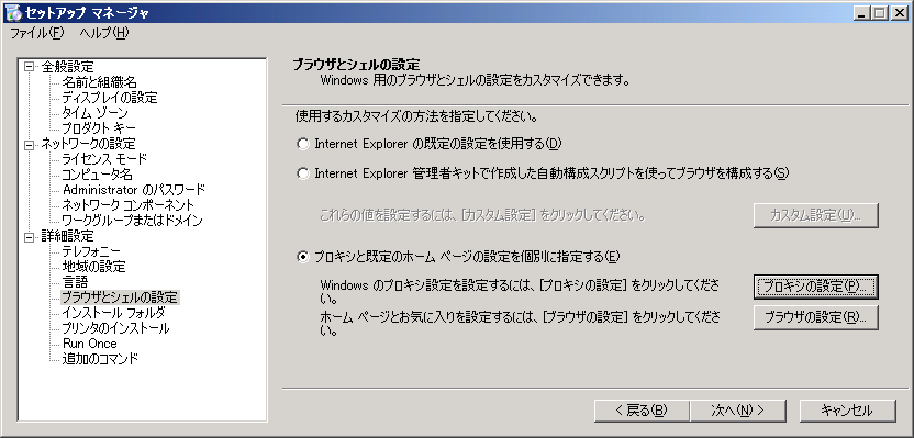 セットアップマネージャーの起動配布共有を新規に作成する場合setupmgr.exeを起動するとウィザードが開始される。次へをクリック。